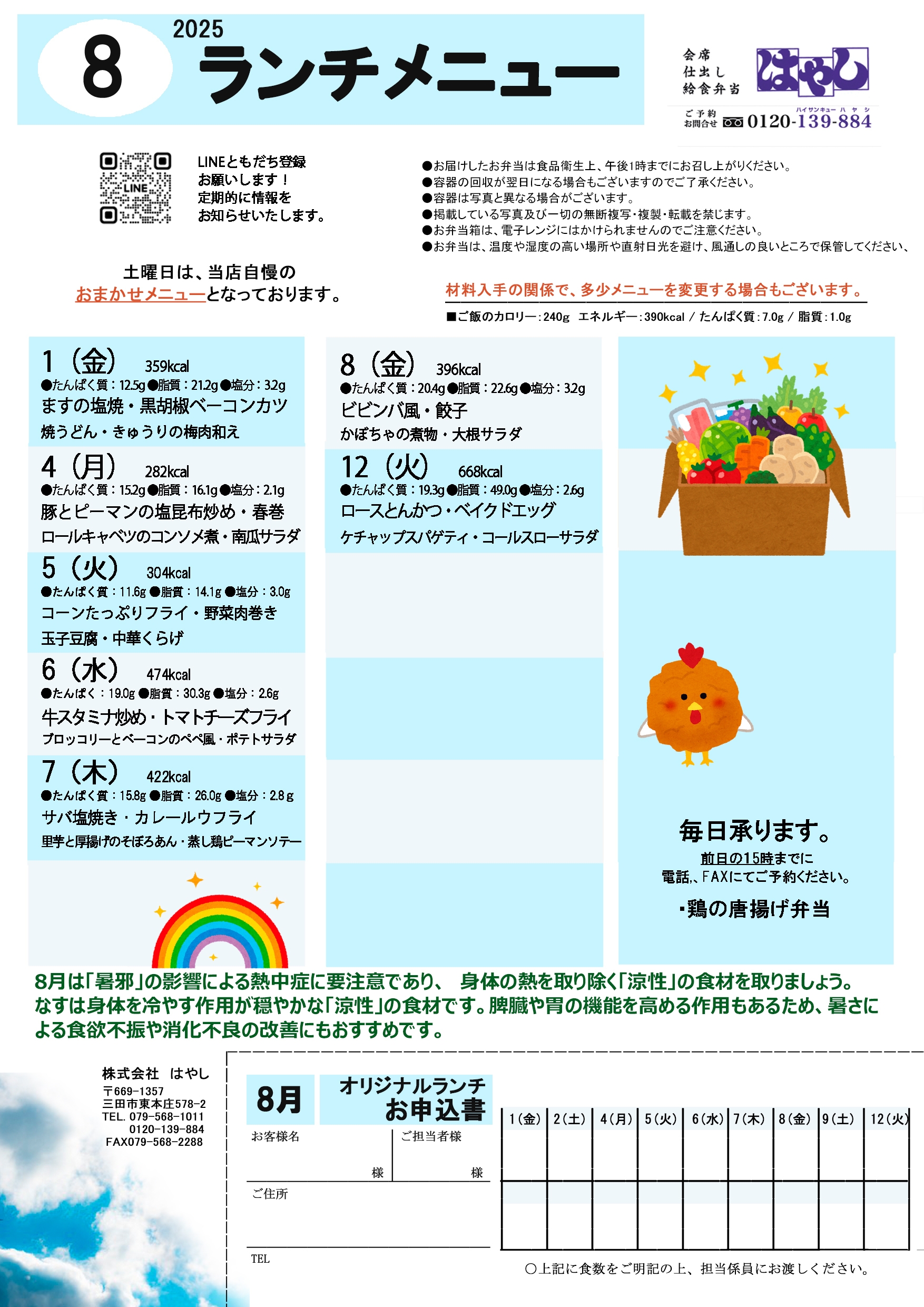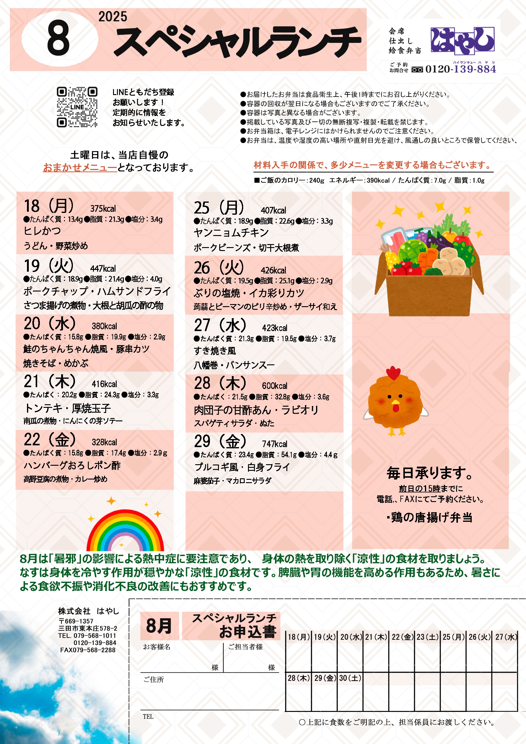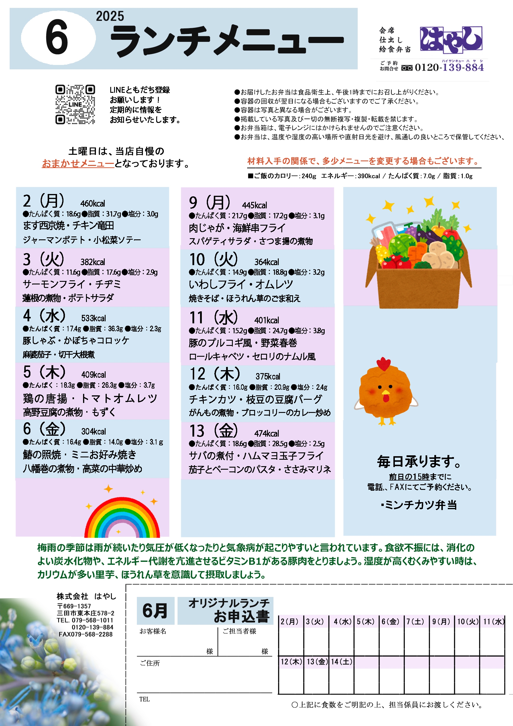 ※写真は一例です。その日のメニューはご確認ください。※お届けした昼食は食品保存料を使用していませんので、お早めにお召し上がりください。※材料の関係で、多少メニューを変更する場合もございます。※容器は写真と異なる場合がございます。※容器の回収が翌日になることもございます。ご了承ください。※地域・個数によっては配達できない場合もございます。あらかじめご確認ください。